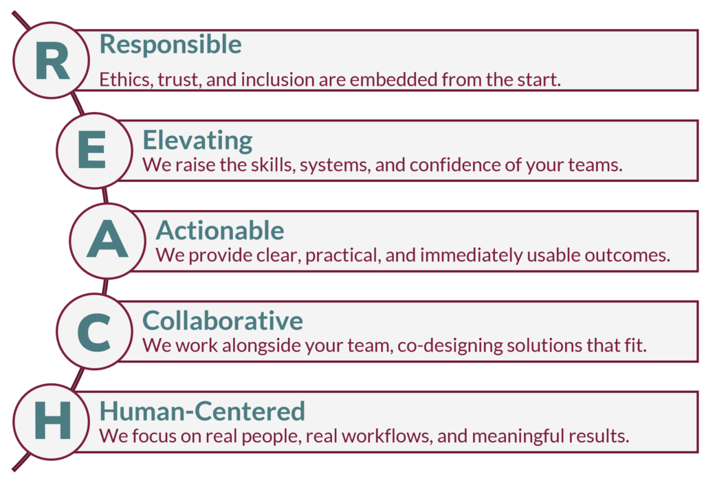 - Value-first approach: Every engagement embeds transparency, ethics, and inclusion from the outset